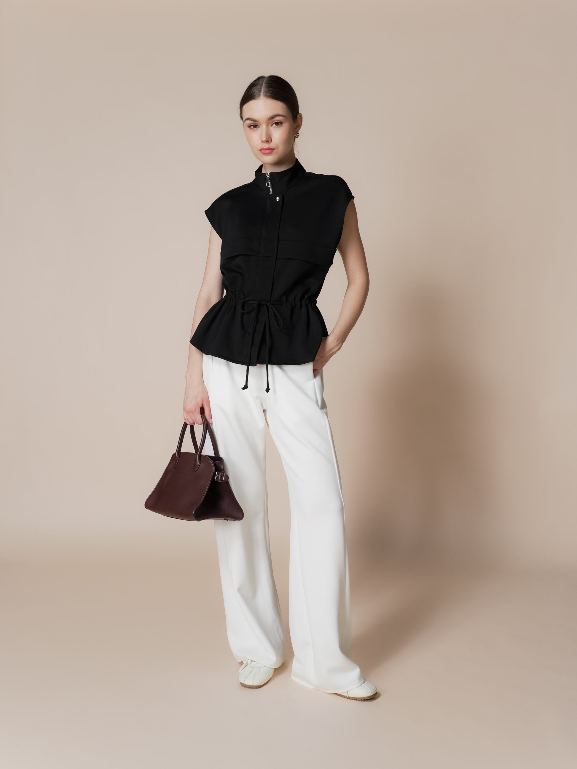 The Cassia Vest features a flattering cinched waist design crafted from soft neoprene fabric. This versatile piece combines functionality with style, offering both zip and snap button closure options for easy on-and-off wear. The structured silhouette creates a polished look whether layered over basics or worn as a standalone piece. Perfect for adding dimension to your everyday wardrobe while maintaining comfort throughout the day.