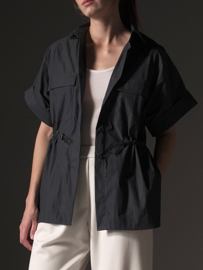 The Vale Top combines lightweight nylon fabric with sporty functionality, featuring a button-down front and a toggle cinch at the waist for a customizable fit. Its sleek design balances comfort and style, making it ideal for active, on-the-go days.